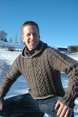 Begynte på denne genseren i høst, og innså raskt at om jeg skulle holde planen med å ha den ferdig til jul, måtte jeg sette på håndbrekket og legge inn et par forsinkelses strategier. Og strikke i smug. Ikke snakk om at Mannen ville overse hvor raskt HANS genser vokste og ikke kreve å få den utlevert ved siste tråds montering! November og desember bestod av kontinuerlige påminnelser om hvor usedvanlig kaldt det var, og hvor varmt og deilig det ville bli med den nye genseren NÅR den ble ferdig! Jeg skyldte på monteringskvaler (som ikke er en helt fiktiv problemstilling i det Bedårske hjem), og på oppløpsia inntraff faktisk en reel og helt uplanlagt forsinkelse. Da skuldercap (flau over et så dårlig norsk ord, men hva heter det??) nr 2 skulle felles, kunne jeg ikke for mitt bare liv få den til å bli lik som skuldercap (grem, det ordet der igjen?) nr 1! Flettene ville ikke ende på samme sted i siste felling. Jeg telte, tegnet, beregnet, og rakk opp 5, FEM!!!, ganger! Etter 4. forsøk bestemte jeg meg for at om det enda ikke blei riktig, skulle jeg rekke opp BEGGE skuldercap'ene (nå begynner jeg å bli lei, altså!) og strikke de simultant. Jeg slapp det. Men skal huske det til en annen gang. Makan til surr!